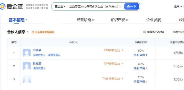 一本烂账 2026年1月13日,随着打假博主一纸举报信的公开,闫学晶母子最后一块遮羞布被彻底撕碎,事情并不是捕风捉影,而是被一条条具体数据顶到了台前。 举报材料先从公司结构撕开缺口,三亚春蓝文化传媒的股权分配明明白白:闫学晶占五成的股份,儿子林傲霏持有三成,剩下两成落在舅舅名下,清一色的亲属持股,完全是 “自家人凑一桌吃饭” 的家族式布局。