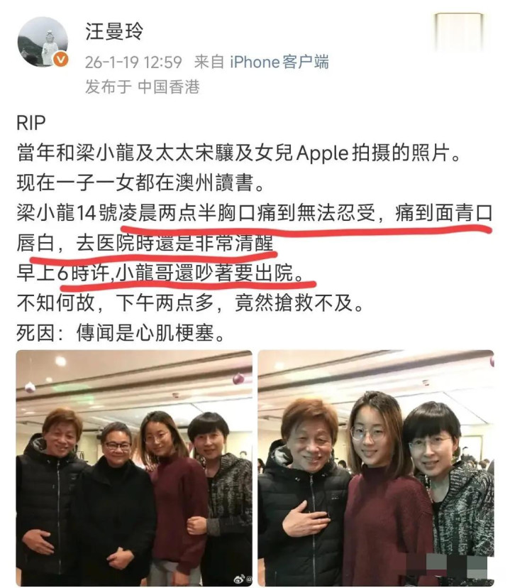 好友汪曼玲的悼念,让我们看清了梁小龙最后时光的模样。1月14号凌晨两点半,他突然胸口剧痛,脸白得吓人,送到医院好不容易稳住了病情,清晨六点就急着要出院,还念叨着还有事要忙。谁能想到,这份一辈子不服输的硬气,没能留住他,下午两点,他还是永远地闭上了眼睛。