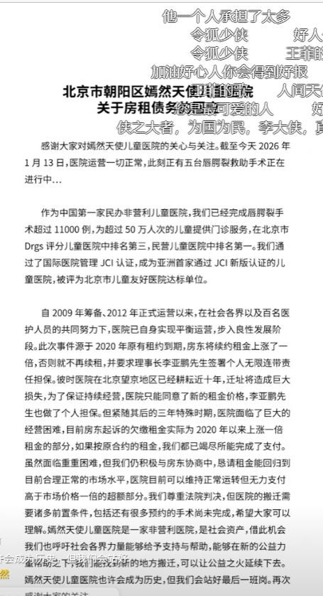 就在这个时候,李亚鹏拍摄了一条长达三十多分钟的视频,向公众说明了医院目前的处境。 他在视频里面没有进行卖惨或者哭穷,而是平静地表示:“嫣然天使儿童医院也许会成为历史,但我们会站好最后一班岗,把手里还有的20台手术做完。”