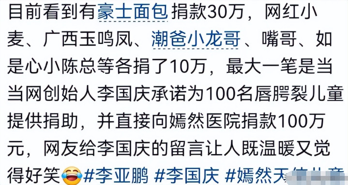 这条视频发出去之后,引发了大量网友的关注。 短短几天的时间里,超过30万人自发地通过嫣然天使基金进行捐款,累计金额迅速突破了1800万元。 这些捐款者当中,绝大多数人是和李亚鹏不相识的,也和娱乐圈也没有什么联系。