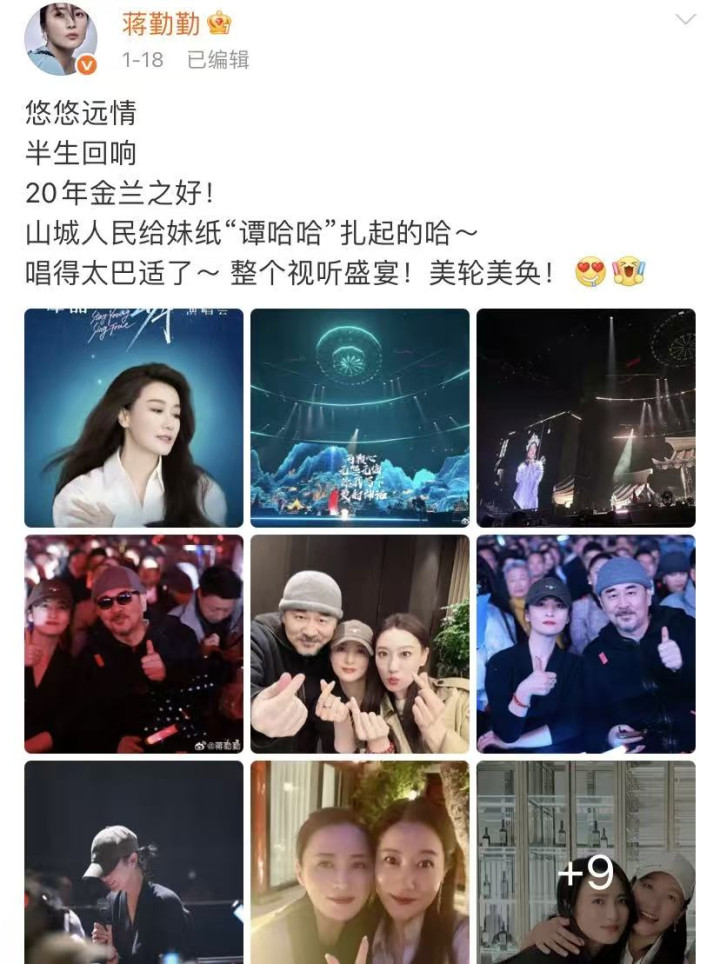 蒋勤勤在自己的微博发了18张照片,给谭晶宣传演唱会。还曝光了几张以前的合影,两位大美女容颜一直都没有变过。
