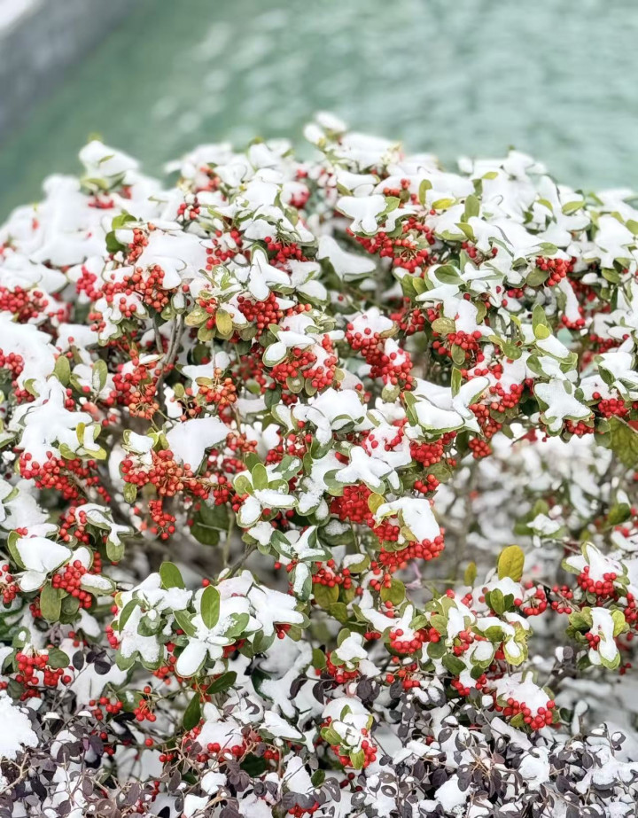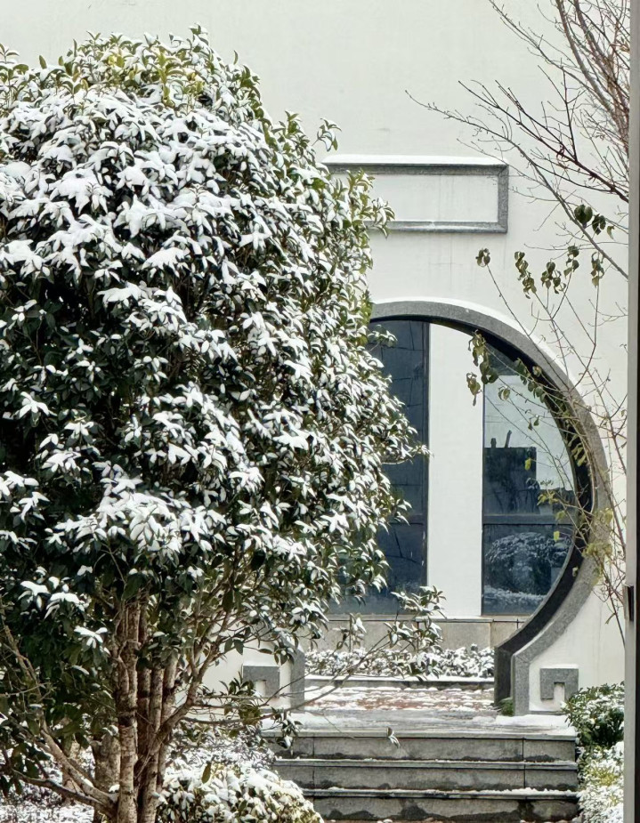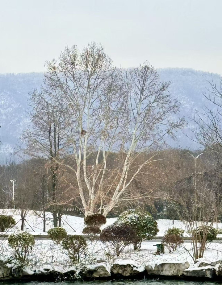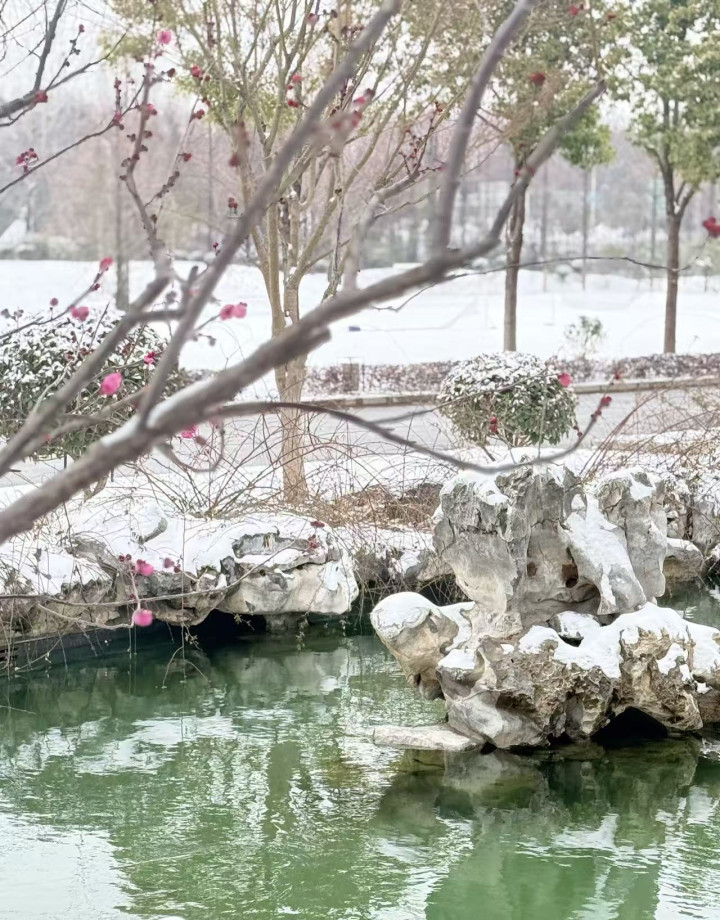 江苏的雪果然如谭晶所说的一样,是彩色的。湖水还是绿油油的,树木也不像北方一样光秃秃。有的树还开满了花,到处都像一幅美丽的油画。