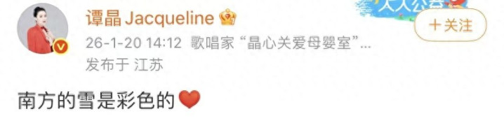 1月20日,很多地方都迎来了暴雪。歌手谭晶也在微博晒出了一组雪照,说南方的雪是彩色的,她的IP地址显示是在江苏。