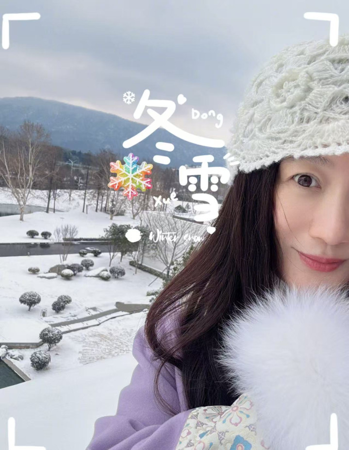 谭晶身穿一件紫色呢子大衣,戴着毛茸茸的手套,整个人都好美。她所住的地方已经白雪皑皑,植物也换了新装。