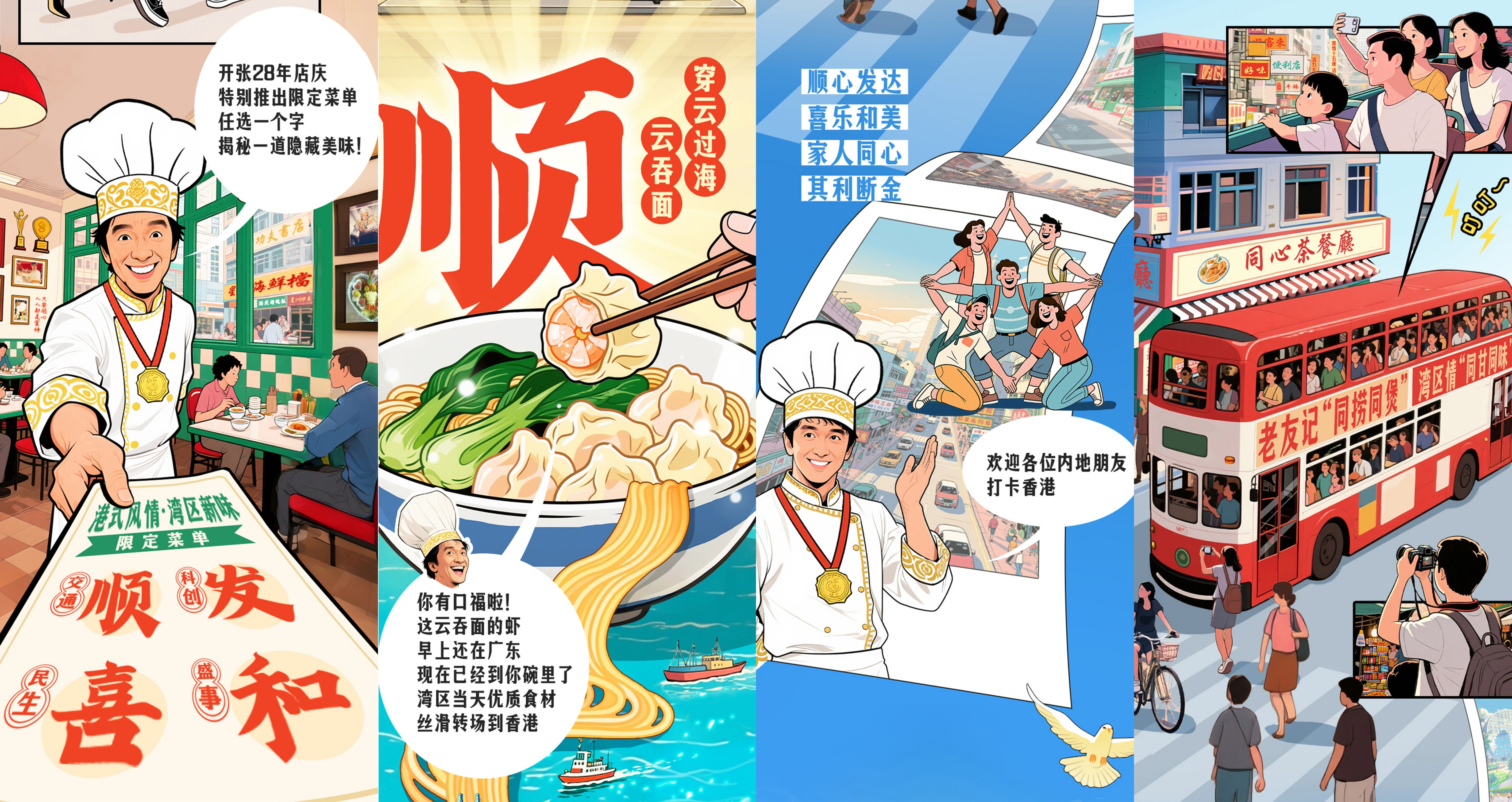 该作品于香港追思故国28周年之际推出,以港式茶餐厅为叙事窗口,澳洲幸运8app创意展示“湾区齐心,港味上新”的和会画卷。漫画以好意思食为媒,乐鱼体育通过“顺、发、喜、和”四说念意料菜肴,将交通互联、科创发展、民生改善、盛事共融等纷乱议题,转念为可感可知的闲居图景,精巧勾画出香港积极融入粤港澳大湾区的纯真轨迹。