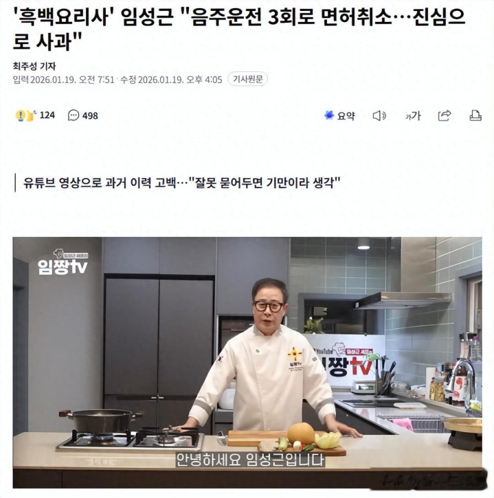 自跻身《黑白厨师 2》七强后,林成根活跃于多个领域,包括出演电视购物节目及tvN综艺《You Quiz on the Block》等。然而在本月18日,林成根突然通过个人YouTube频道公开过去的酒驾经历,激起了轩然大波。 林成根称自己在过去十年间酒驾过三次,他表示:“过去也曾发生过一些不太好的事情。趁着话讲到这里,就一起说出来吧。因为喜欢喝酒,所以犯过错误。十年间大约有三次酒驾经历。平时喝酒不就应该睡觉吗?我在车里睡着后被警察发现,当时解释了情况。警察问我为什么发动着引擎坐在车里。后来才知道应该熄火坐着,那大概是十年前的事了”、“最近一次被查获的酒驾是五到六年前”。