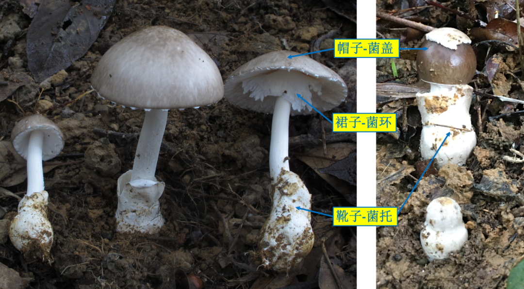 假褐云斑鹅膏 与剧毒的肝损害型鹅膏雷同,头上带帽(菌盖),腰间系裙(菌环),脚上穿靴(菌托)。常生于壳斗科林地上或以壳斗科和松科为主的混交林地上。此前,在坪山碧岭发现存无数假褐云斑鹅膏。