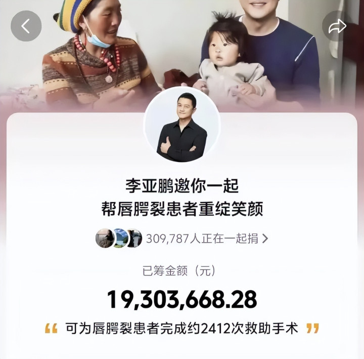 1月16日下午,李亚鹏发视频表达谢意。 他透露,在过去两天内,超过18万名捐赠者共计捐赠善款约900万元,“这些善款能够大致完成1000台左右的唇腭裂手术。”