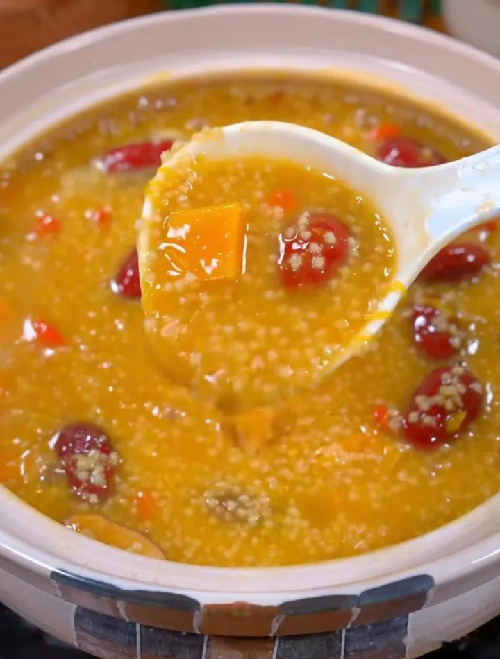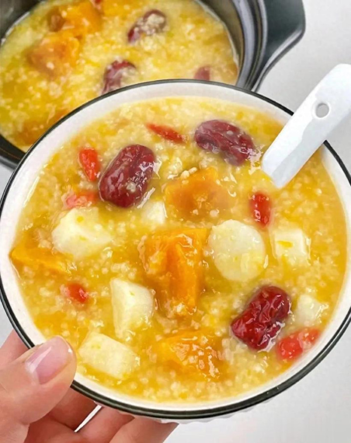 属目作念法 1. 黑米、红豆提前用净水浸泡4小时(或隔夜浸泡),花生、莲子洗净浸泡30分钟。 2. 通盘食材(除枸杞、冰糖外)放入砂锅,加足量净水,大火烧开后转小火慢熬1.5小时。 3. 煮至豆子、米类软烂,汤汁浓稠,放入枸杞、冰糖,再煮10分钟即可。 功效小贴士 多种杂粮搭配,养分全面,黑米补肾、红豆祛湿,健脾养胃、补气血,合适全家当早餐,提前预约煮更绵薄。 3. 小米南瓜粥 食材准备 小米100g、南瓜300g、红枣4颗、枸杞一丝、冰糖适量(可选)