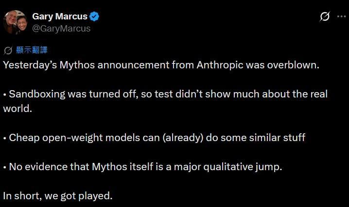 Mythos让各人腐化了好几天,终于有大牛腻烦了。 率先站出来开炮的是杨立昆。杨淳厚昨晚指出,“Anthropic的Mythos营销戏是自我痴迷的瞎掰八谈”。 杨立昆在工夫不雅点上的老敌手、AI品评家、大模子怀疑论者、纽约大学西席加里·马库斯,当天凌晨的措辞稍温存些:“Mythos的炒作大部分是听说迷想(The Mythos stuff was mostly a myth)……攻破火狐浏览器时,浏览器的沙箱被关闭了。其他功能能被低价的怒放权重模子已毕。莫得字据证明Mythos自身是质变飞跃。浮浅讲,各人被耍了”。