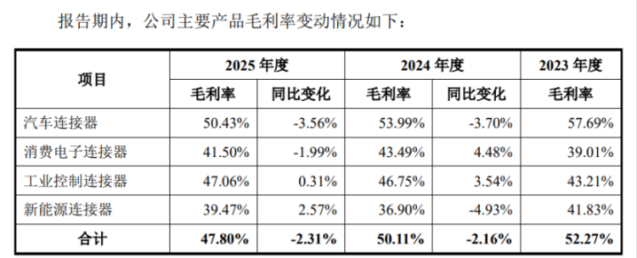 关于高毛利率,念念索技能讲解称其家具主要讹诈于汽车车灯领域,靠近的竞争敌手多为海外品牌,因此具备较强的议价才气。但招股书同期炫耀,其主交易务毛利率呈下落趋势,由2023年的52.27%降至2025年的47.80%,中枢的汽车采集器业务毛利率更是从57.69%下滑至50.43%,两年累计下落7.26个百分点。