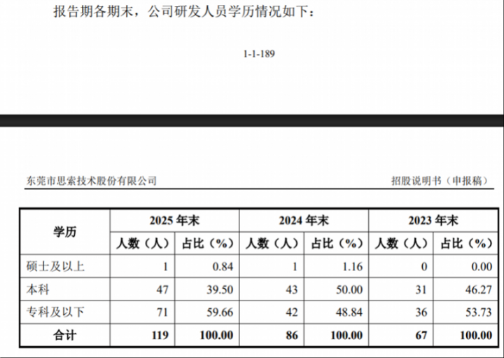 在现款流方面,论述期内公司筹备算作产生的现款流量净额抓续低于同期净利润。2025年,该比率(净现比)仅为0.81,标明公司部分利润以应收账款体式存在。数据炫耀,其应收账款账面价值从2023年末的1.33亿元增至2025年末的2.31亿元,占当期交易收入的比例也由35.39%升至37.02%。 研发东说念主员专业及以放学历占比拟高,高端化转型存挑战 创业板定位强调企业的研发改进才气。招股书炫耀,念念索技能的研发东说念主员数目从2023年末的67东说念主增至2025年末的119东说念主,增幅近78%。