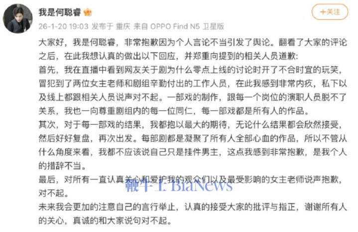 刚刚,短剧演员何聪睿就“何聪睿戏扑甩锅女主”一事道歉。 此前,何聪睿在直播回应新剧《四姊妹的八零年代》凌晨上线争议时,自称是“无足轻重的挂件男主”,称作品播出效果不佳要赖也是先赖女主,“女主能顶大半边天”等,引发甩锅争议。 原文如下: 大家好,我是何聪睿,非常抱歉因为个人言论不当引发了舆论。翻看了大家的评论之后,在此我想认真的做出以下回应,并郑重向提到的相关人员道歉: 首先,我在直播中看到网友关于剧为什么零点上线的讨论时开了不合时宜的玩笑,冒犯到了两位女主老师和剧组辛勤付出的工作人员,在此我感到非常内疚,私下以及线上都跟相关人员说声对不起。一部戏的制作,跟每一个岗位的演职人员脱不了关系,我也一向尊重剧组内的每一位同仁,每一部戏都是所有人的作品。 其次,对于每一部戏的结果,我都抱以最大的期待,无论什么结果都会欣然接受,然后好好复盘,再次出发。每部剧都是凝聚了所有人全部心血的作品,所以不管从什么角度来看,我都不应该说自己只是挂件男主,这点我感到非常抱歉,是我个人的措辞不当。 最后,对所有一直认真关心和爱护我的观众们以及最受影响的女主老师说声抱歉,对不起。 未来我会更加的注意自己的言行举止,认真的接受大家的批评与指正,谢谢所有人的关心,真诚的和大家说句对不起。 {jz:field.toptypename/}