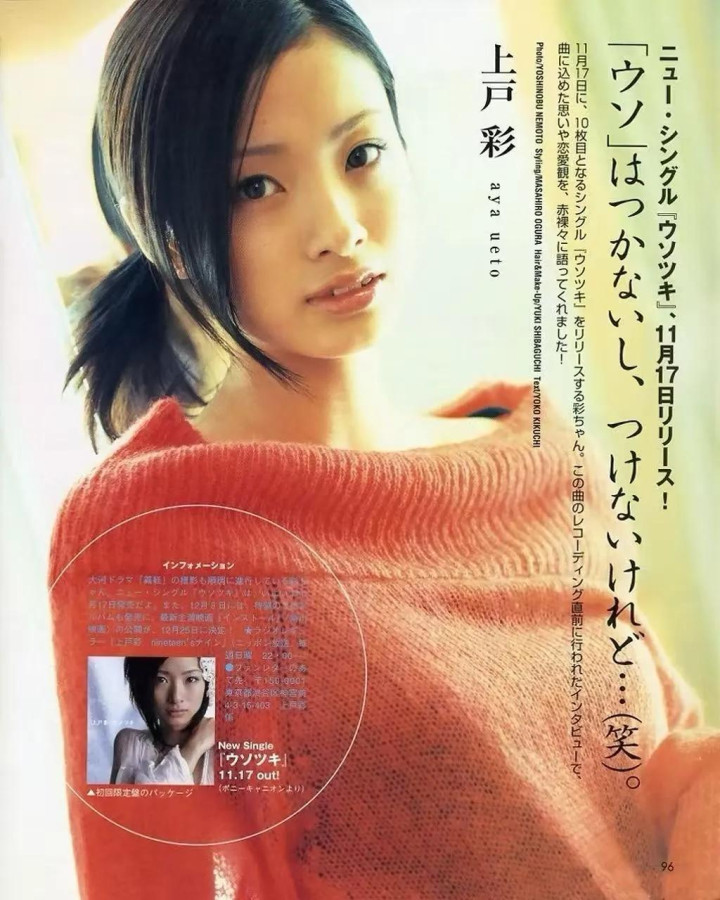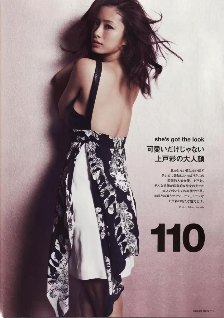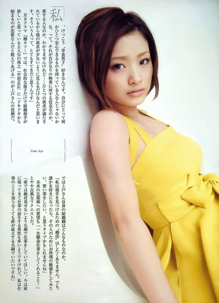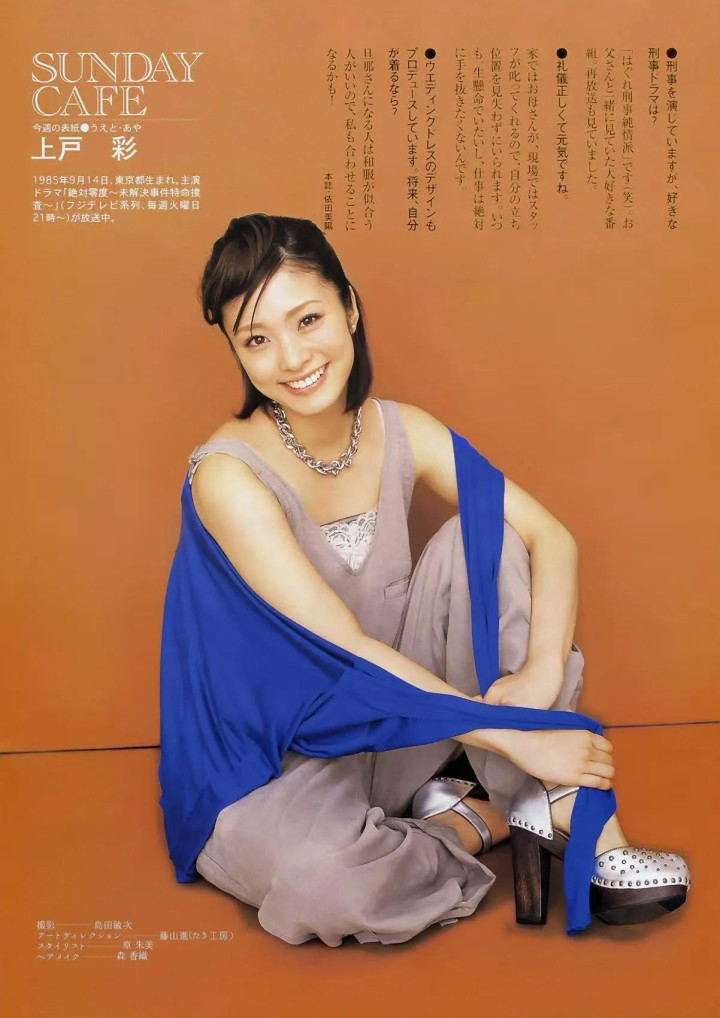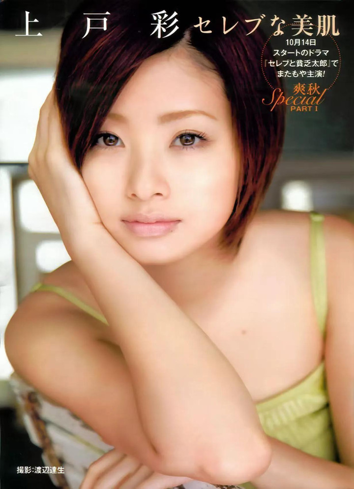 (1005)太阳国人对上户彩的爱称是"平成的山口百惠"。上户彩清纯的面孔、无邪的笑容、纯洁的气质,代表了国民理想中的本国女人的形象。 1985 年出生的上户彩,在 1997 年第七届"全xx国民的美少女比赛"中获奖。1999 年组成四人偶像成员 Z 一1正式出道。 2003 年以后,她既歌又演,发行首张录音室专辑。主演电视剧《少女杀手阿墨》、《献给一个夏天的爸爸》、《网球甜心》、《古都》等。2006 年的电视剧《甜心空姐》被引进中国,在各大卫视播出,赢得了好口碑,也为中国观众所熟知。