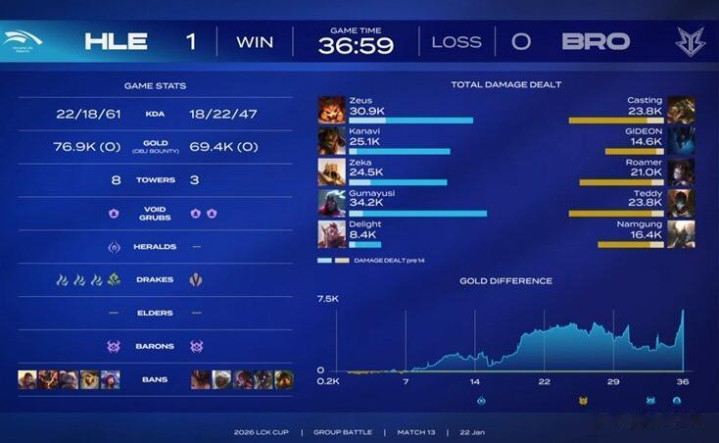 1月22日,在2026年《英雄联盟》LCK杯小组赛中,HLE以2:1战胜BRO。此前均为两战皆负的两支队伍展开对决,HLE最终拿下这场宝贵的首胜。不得不说,HLE在这个系列赛仍然暴露了很多问题,这支队伍非常依赖中野组合的发挥,但Kanavi和Zeka都存在不稳定性。Zeus和Gumayusi的顺风局表现尚可,逆风局就很容易哑火。BRO是一支实力较弱的队伍,却能和银河战舰的HLE打得旗鼓相当,这就很问题。