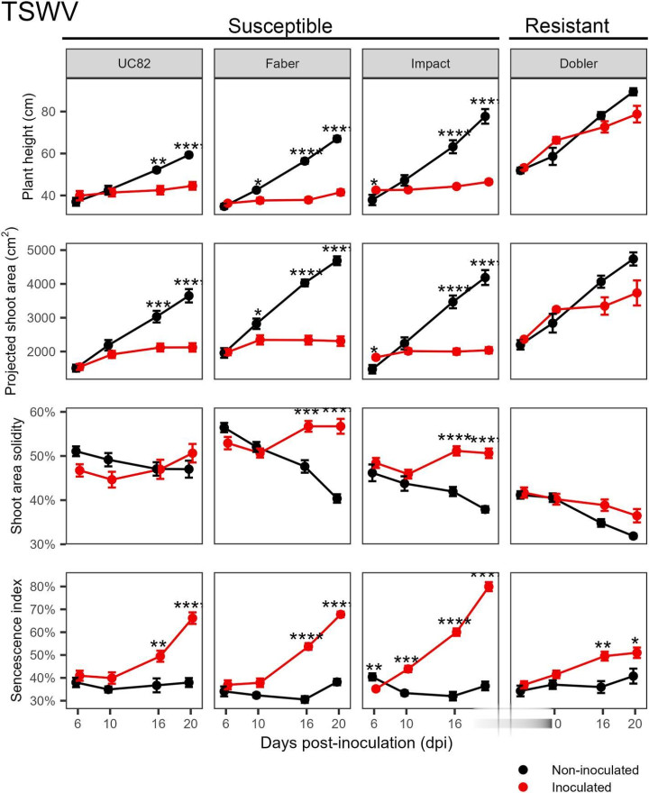 图2.穗密度估算与手工测量的对比分析图 高通量表型本领可灵验分离不同番茄基因型对恐吓的响应各别,对番茄斑萎病毒(TSWV)恐吓的辨别后果尤为显贵。商议发现,乐鱼体育官网抗性基因型(Dobler F1)在病毒感染后,植物的高度和投影茎叶面积变化较小,而易感基因型(UC82)则显贵助长受限。高通量表型本领本领可量化基因型的抗性各别,为精确育种和抗性料理提供数据维持。但是,关于根系病害(如贪污根病和根结线虫),HTP难以灵验分离抗性与易感基因型,标明其对地上部病害识别优于根系病害。此外,高通量表型本领能识别部分品种的耐旱性各别,但与水分诓骗遵循(WUE)的闭幕乌有足一致,需聚合其它生理计较详细判断。