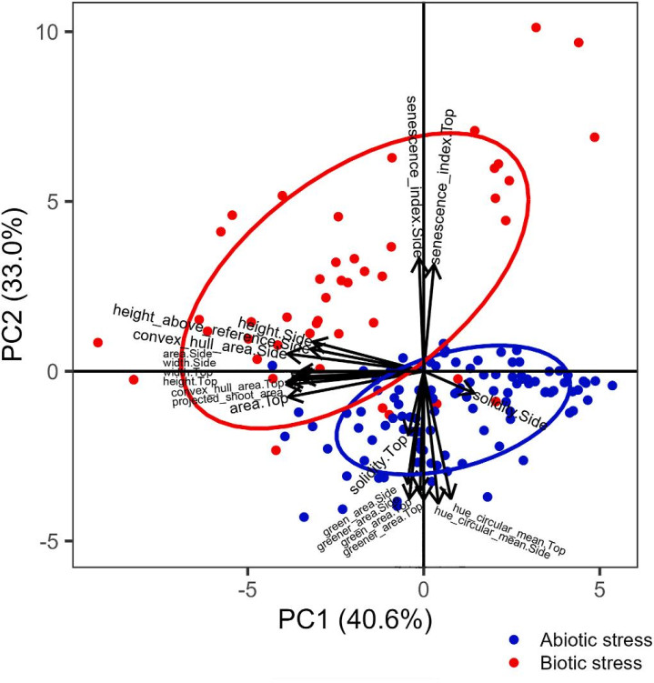 图1.田间小麦考研平台和Phenomobile测量树立暗示图 商议标明,朽迈指数是分离番茄植物在生物和非生物恐吓下反应的紧迫计较。生物恐吓(如番茄斑萎病毒)导致提前朽迈,通晓为叶片黄化与坏死;而非生物恐吓(如干旱)则促使叶片更绿并收尾植物助长。朽迈指数通过色度数据分析,能精确分离两种恐吓类型,匡助植物健康情状的精确会诊。主因素分析(PCA)进一步考据了神采计较(如朽迈指数、绿色区域)与花式计较之间的正交漫步,超越其在恐吓类型分离中的作用。