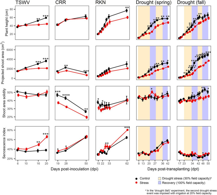 2025 年 9 月,意大利国度商议委员会 Maria Isabella Prigigallo等在Plant Phenomics期刊发表题为High-throughput plant phenotyping identifies and discriminates biotic and abiotic stresses in tomato的商议,系统考据 RGB高通量表型本领在番茄多种恐吓识别中的应用,明确其可分离生物与非生物恐吓,并通过朽迈指数等要道计较识别恐吓类型及抗感基因型各别。